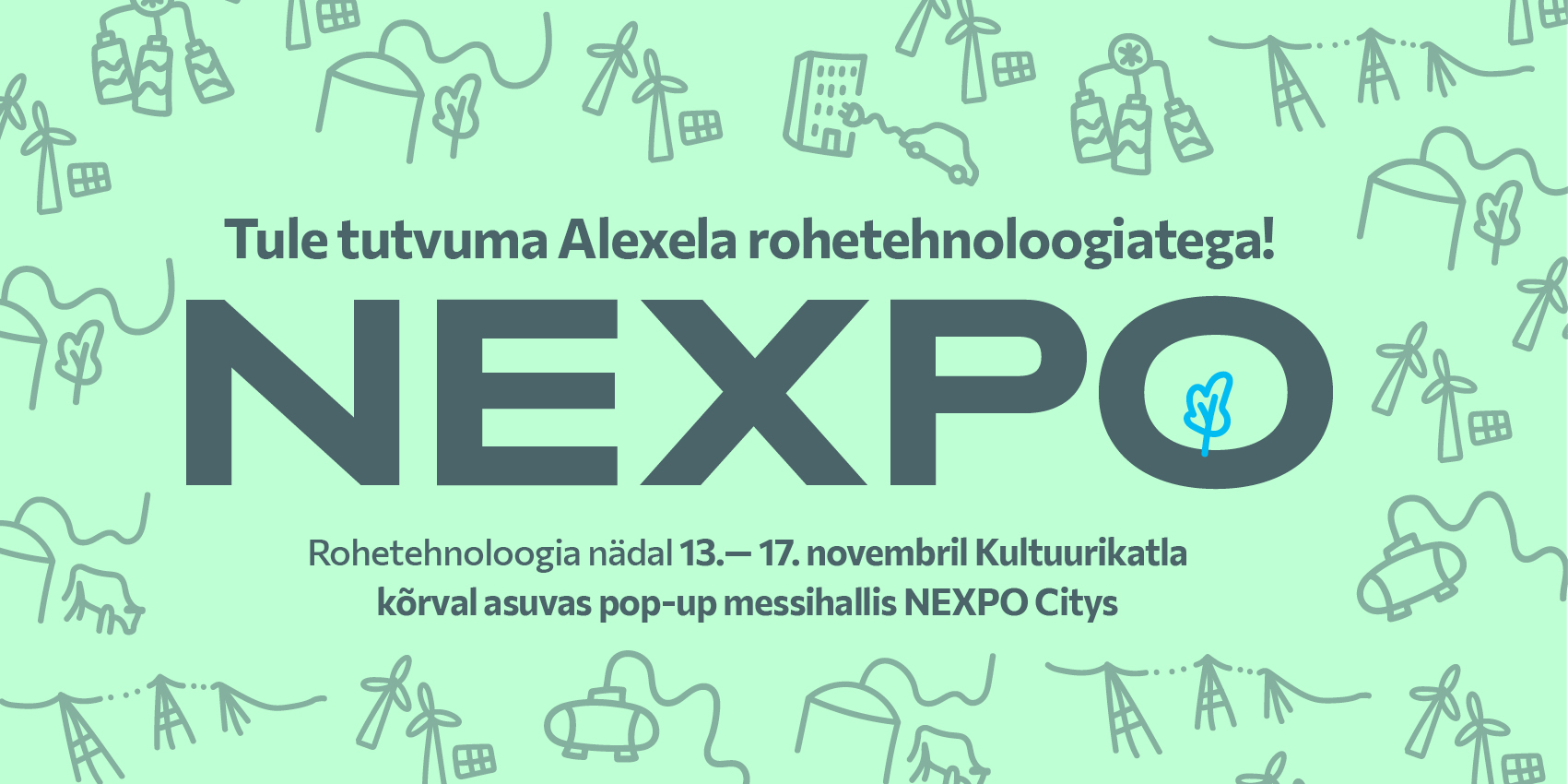Alexela osaleb Tallinna Rohetehnoloogia nädala raames NEXPO-l, mis toimub 13.-17.11.23 Kultuurikatla kõrval asuvas pop-up messihallis. Üritusel tutvustatakse värskemat rohetehnoloogiat kõikjal maailmast ning tuuakse kokku erinevaid ettevõtteid.